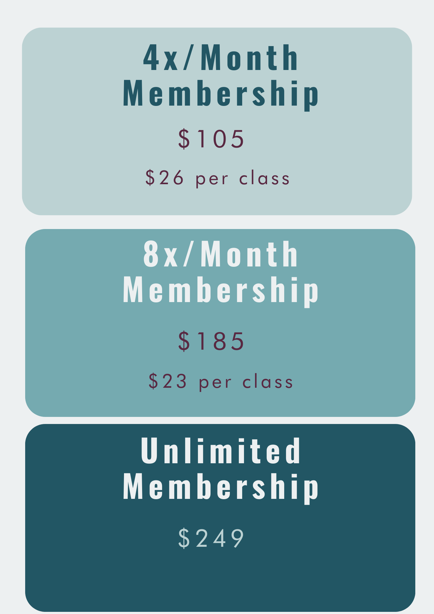 Discounted Drop Ins: Want to move your body a little extra this month? 4x and 8x members get discounted drop ins for once they've used all their classes for the month